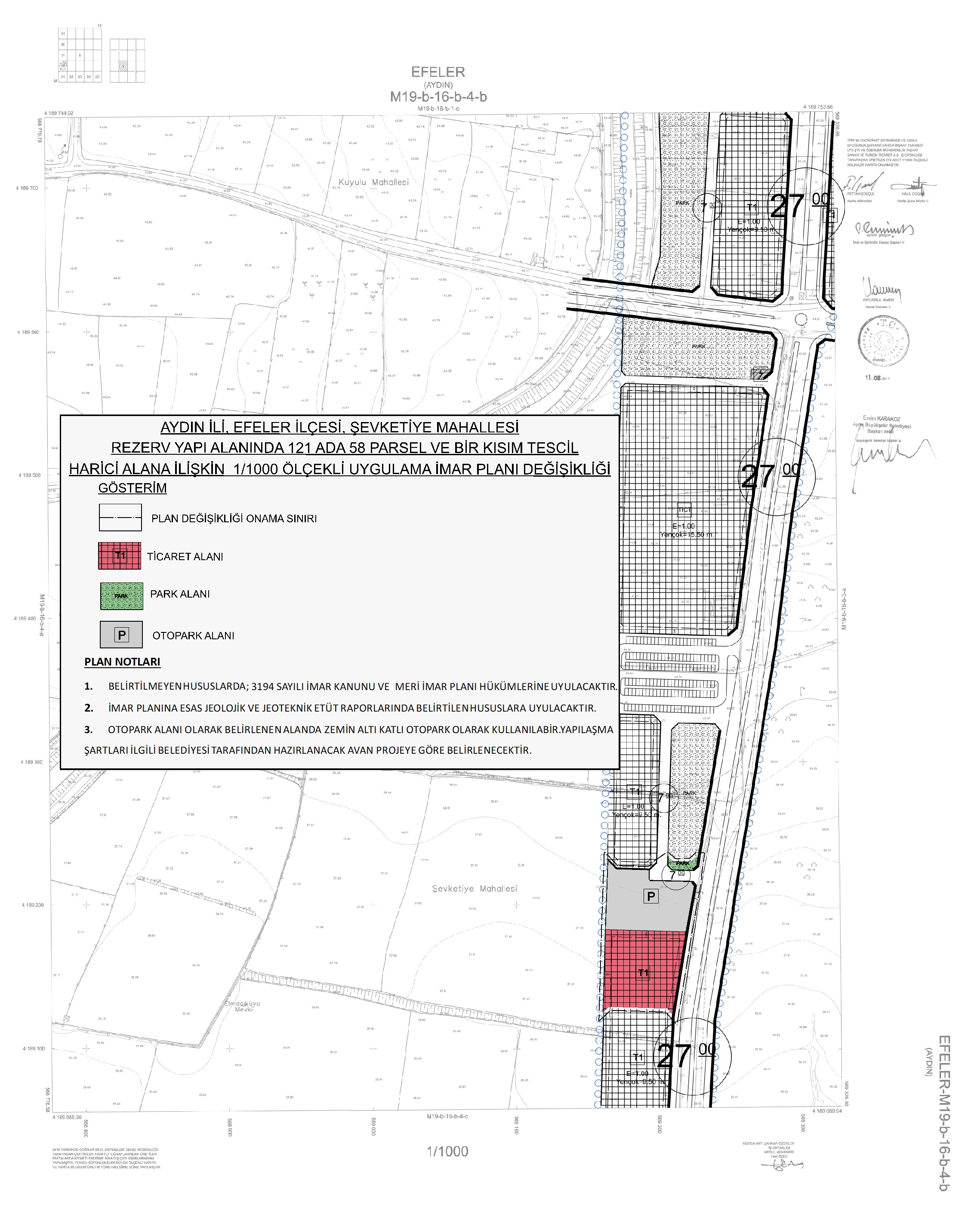 Aydın İli Efeler İlçesi, Işıklı, Kuyulu ve Şevketiye Mahallelerinde yer alan yaklaşık 109 hektarlık rezerv yapı alanında, Bakanlığımızca onaylanan imar planları içerisinde kalan 121 ada 58 parsel (eski 121 ada 13 parsel) ve bir kısım tescil harici alana yönelik plan değişikliği talebinde bulunulmuş talebe ilişkin hazırlanan "Aydın İli, Efeler İlçesi, Şevketiye Mahallesi 121 Ada 58 Parsel ve Bir Kısım Tescil Harici Alan İlişkin 1/5000 Ölçekli Nazım İmar Planı Değişikliği ve 1/1000 Ölçekli Uygulama İmar Planı Değişikliği" imar planı değişiklikleri uygun görülerek 6306 sayılı Afet Riski Altındaki Alanları Dönüştürülmesi Hakkında Kanunun 6. Maddesinin 6. Bendi uyarınca re'sen onaylanmıştır.