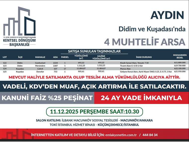 Bakanlığımız Kentsel Dönüşüm Başkanlığı tarafından 11-12 Aralık 2025 tarihinde 47 ilde 340 muhtelif arsa satış ihalesi