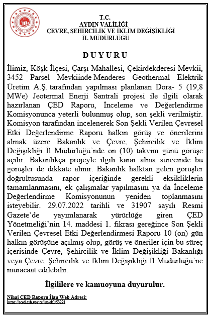 İlimiz, Köşk İlçesi, Çarşı Mahallesi, Çekirdekderesi Mevkii, 3452 Parsel Mevkiinde Menderes Geothermal Elektrik Üretim A.Ş. tarafından yapılması planlanan Dora- 5 (19,8 MWe) Jeotermal Enerji Santrali projesi ile ilgili 29.07.2022 tarihli ve 31907 sayılı Resmi Gazete’de yayımlanarak yürürlüğe giren ÇED Yönetmeliği gereğince hazırlanan Çevrimiçi ÇED Süreci Yönetim Sistemi (e-ÇED) üzerinden sunulan Çevresel Etki Değerlendirmesi Raporu, Komisyonca yeterli bulunmuş olup son şekli verilmiştir. 29.07.2022 tarihli ve 31907 sayılı Resmi Gazete’de yayımlanarak yürürlüğe giren ÇED Yönetmeliği’nin 14. maddesi 1. fıkrası gereğince İnceleme ve Değerlendirme Komisyonu tarafından incelenerek Son Şekli Verilen ÇED Raporu’nun 10 (on) takvim günü halkın görüş ve önerilerine açılmıştır. İlgililere ve kamuoyuna duyurulur. Detaylı açıklama |
